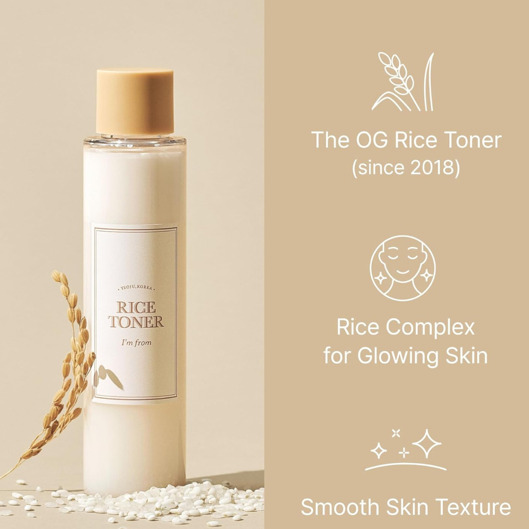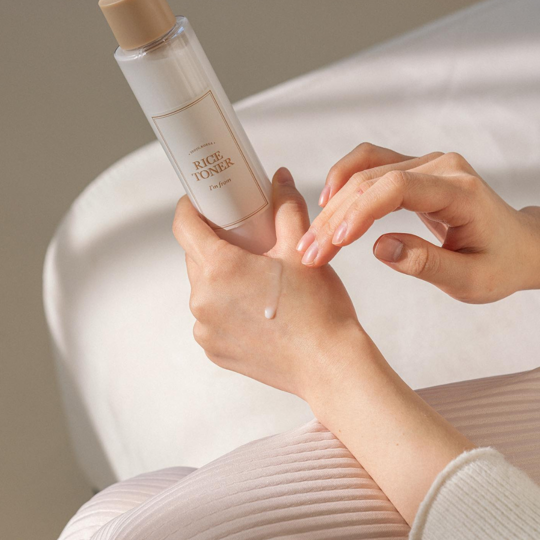 Swipe on I'm From Rice Toner for hydrated and radiant skin. It forms a protective barrier over the skin to prevent water loss, eliminates dead skin cells, and rebalances dry and tired barriers.
